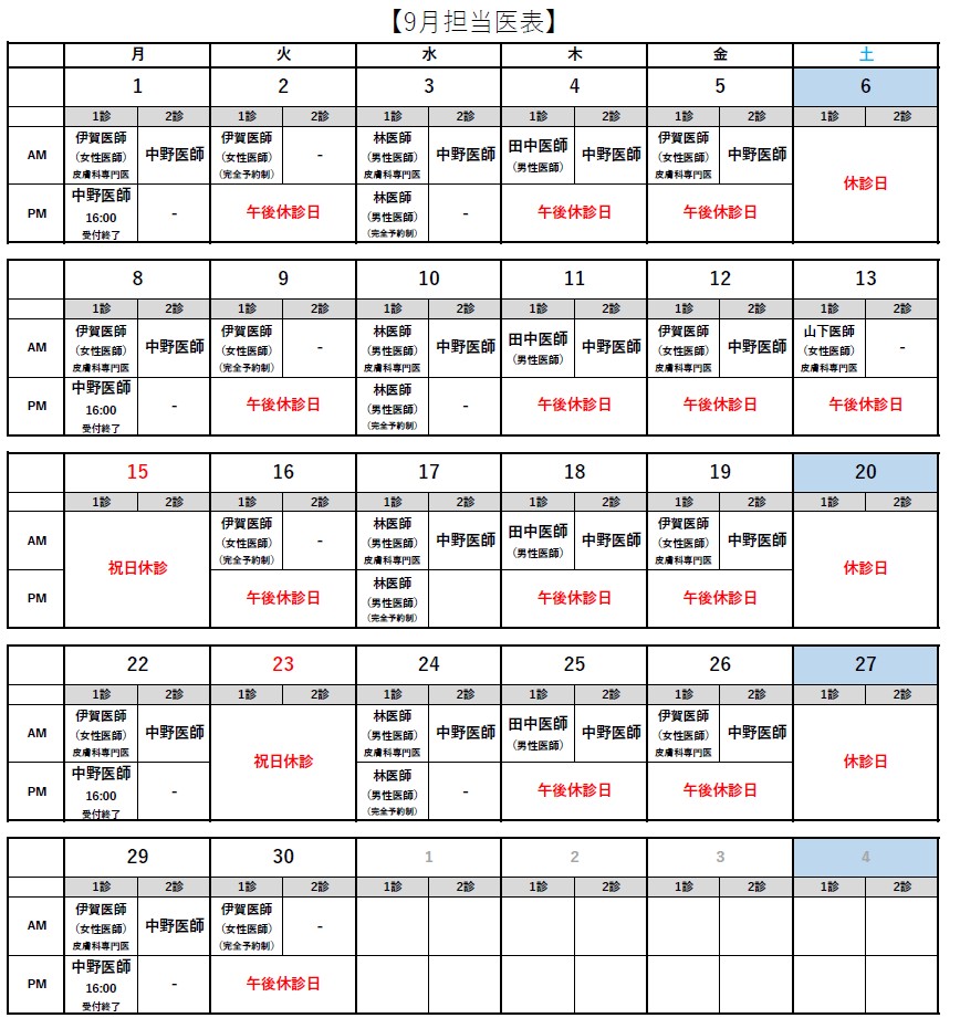 9月の土曜日の診療日は9/13(土)の午前診になります。