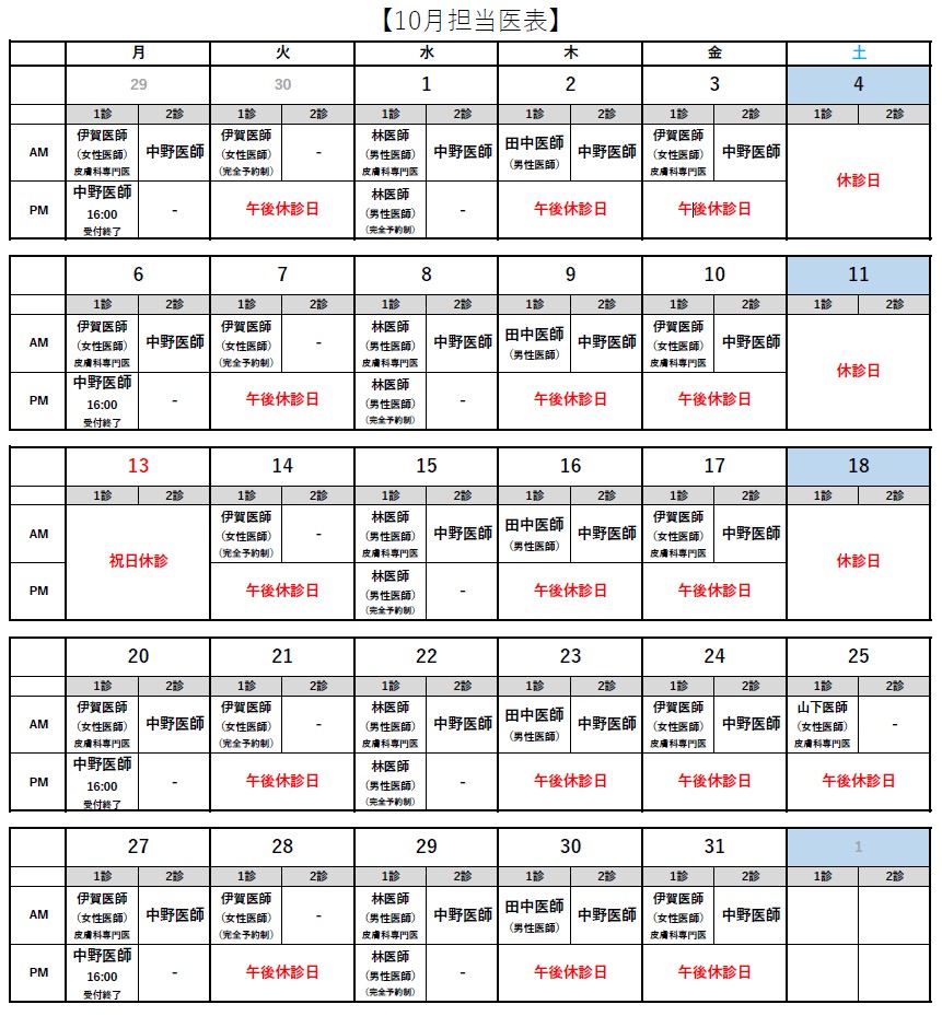 10月の土曜日の診療日は10/25(土)の午前診になります。